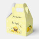 This adorable favour box design has a yellow and white background pattern. On the front and back panels there's a brown wicker basket full of lemons. The text reads "Bee Happy!", with a little bee. The side panels feature two whole lemons and one half of a lemon. All text can be customized.