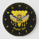 Honey bee with open wings icon over bee hive and honey drops. Custom background colour. Custom text.