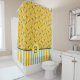 This sweet bee pattern shower curtain shows honeybees over a light, bright golden-yellow honeycomb background. The yellow and black bees have gossamer white-blue wings. They're crawling over the honeycomb inside their beehive. The bottom is edged in a golden and off-white stripe pattern that includes a honeycomb shape and room for your personalized monogram letter. This nature - inspired shower curtain is perfect for a pretty, country home decor theme.