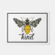 This door mat design features an ornate bee on the front with the work "kind" written below in a script font. The bee design is black and yellow on a bright white background.