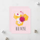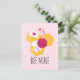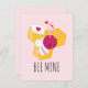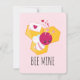 A flat card with an adorable image of a pink and white striped bumble bee. A piece of yellow honeycomb behind. A letter sealed with a heart and a group of floating hearts are also part of the design. Editable text says" Bee Mine.