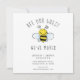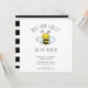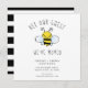 Faire-part amusante avec une adorable abeille avec le dicton mignon "Be Our Guest" posé sur un arrière - plan blanc. Retournez notre nouvelle carte d'adresse pour voir un arrière - plan à rayures noir et blanc de coordination.