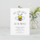 Faire-part amusante avec une adorable abeille avec le dicton mignon "Be Our Guest" posé sur un arrière - plan blanc. Retournez notre nouvelle carte d'adresse pour voir un arrière - plan à rayures noir et blanc de coordination.