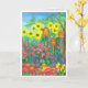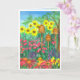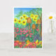 A pretty and colourful happy birthday greeting card decorated with a watercolor painting of a flower garden with three bee skeps, tall sunflowers, coneflowers and other cottage garden flowers in bright colours.