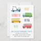 A kid's birthday party invitation featuring tow truck, fire truck, garbage truck and a school bus.