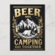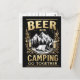 A black and gold illustration depicting a mountain scene with a tent, two beers, and the text Beer And Camping Go Together.