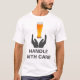 Photo of a glass of beer, an image of human hands or palms, text Handle with care. Funny one-of-a-kind white or light t-shirt for men. Customizable. You can change the images and you can change or delete the template text. Do not forget to change the gender, style and colour of the t-shirt. Have fun.