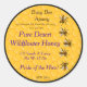 Golden yellow honeycomb background with a black ring background and five honey bees arranged vertically on the right side. Each line of text is fully customizable and in coordinating dark brown and purple.