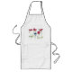 A nice floral apron decorated with bright pink cosmos flowers and a royal blue nigella with honey bees buzzing by drawn in black pen and ink with watercolor.