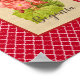 Vintage botanical illustration features bouquet of begonia on layer with the look of ecru burlap. Modern script title text overlay and a background of red and white quatrefoil pattern