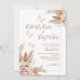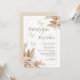 Modern butterfly kisses and baby wishes baby shower invitation featuring a bohemian style dry floral arrangements with pampas grass and beige and brown coloured text. The design also features three faux gold glitter butterflies.
