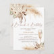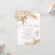 Bohemian floral themed bridal shower invitation featuring two natural tones beige and brown floral arrangements with pampas grass, a champagne glass and an elegant modern calligraphy heading image.