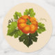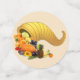 Beautiful horn of plenty with pumpkin, fruits and autumn leaves on light beige and brown Table Confetti.