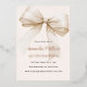 A soft beige, cream coloured background, decorated with a large bow. Personalize and add a name and party details. The name and the word Quinceañera are written with real rose gold foil.