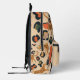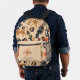 This personalized backpack features leopards and feathers on a pattern of abstract leopard spots in black, gold, orange and green on a beige background. Add a monogram and first name in modern black and orange script to the beige pocket, with the full name below in black sans serif font. Ideal for back to school!