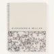 Personalized notebook features a stylish dainty floral pattern in a modern beige linen and grey colour palette. The top features a simple plain beige linen background with custom name presented in a modern script. The bottom features a stylish dainty floral pattern in a linen, grey with hints of light pastels.