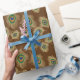 Vector drawing of peacock feathers, enhanced and rendered in a soft conte crayon effect - soft golden beige and tan feather, with rust, cobalt blue, and emerald green eye, on a chocolate brown background Wrapping paper