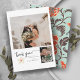 A delicate beige peony draws the eye to thank you note with a photo of the wedding couple, with a simple elegant font for details. Orange-pink peonies with a light pastel green background chinoiserie print complements the look for that extra special touch.