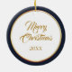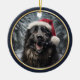 On the front of this Holiday ornament is a beautiful portrait of a black Belgian Sheepdog Dog wearing a red and white Santa hat in front of snow covered winter pine trees. The image is framed in shiny gold and dark blue. The back of the ornament has your custom text in gold.