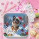 A heartwarming holiday illustration featuring a cheerful dog playing in the snow, wearing a Santa hat and surrounded by colourful gift boxes. In the background, children build a snowman beside a snow-covered Christmas tree, creating a joyful winter wonderland. Perfect for spreading holiday cheer and capturing the magic of Christmas.