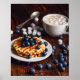 Dessert with belgian waffles, fresh blueberry and honey on white plate, Cup of hot chocolate with marshmallow