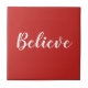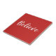Believe Christmas ceramic tile, with a bright red background. With white lettering, you can customize with your own text. A great decor item for your holiday kitchen decor!