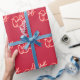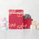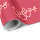 Graphic Christmas wrapping gift paper in warm red, and white. Reads Believe. Uniquely designed by Sarah Trett.
