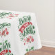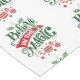 A tablecloth with a cool illustration. Text says Believe in the Magic in fancy lettering. Decorated with christmas balls.