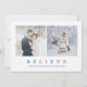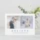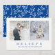 This elegant, simple Christmas card features two of your personal photos, and the word "believe" in modern blue text. The back contains a trendy blue leafy design for a totally stylish holiday look.