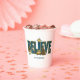 The word "Believe" with a beautiful nativity scene on a holiday paper cups containing the manger with baby Jesus, Mary, Joseph, a shepherd, sheep and a donkey. You can customize with your own quote. Great for Christmas parties or for Christian family and friend get-togethers over the holidays.