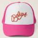 Typographical believe slogan hat. Reads: believe. Uniquely designed by Sarah Trett.