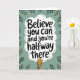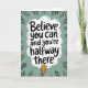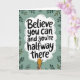 Send a powerful, positive message with this cute, hand-drawn inspirational card. It features the famous motivational quote: "Believe you can and you're halfway there," presented in bubbly white text inside a cloud shape. The card is framed by a stylish botanical border of leaves and set on a trendy sage green background. A small hand clutching a lightning bolt adds an extra spark of energy and action. This design is perfect for encouragement notes, good luck cards for exams or interviews, or as a general positive affirmation gift. Ideal for women, students, and anyone who loves a fun, natural aesthetic.