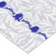 This tablecloth has the classic bell-and-pomegranate motif in blue with  leaves and a the words "Shabbat Shalom" and "Koved Shabbat Kodesh" in  Hebrew.