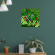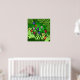 A poster with colourful bell shaped flowers in a green leafy grassy background.