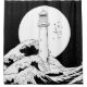 A black and white line art illustration of Bell Rock lighthouse in Scotland. Huge waves crashing around the base of the lighthouse.