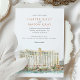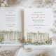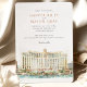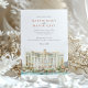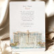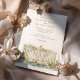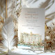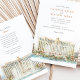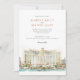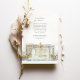 Invite your guests to a spectacular celebration with this elegant watercolor wedding invitation, featuring the iconic Bellagio Hotel & Casino in Las Vegas. The artwork beautifully captures the grandeur of the resort, with its distinctive cream, beige, and light ochre facade, reddish-brown/terracotta lower level accents, and hints of blue-green in the window and roof details. The famous Fountains of Bellagio are depicted in full display with white plumes of water, all reflected in the serene foreground lake. The scene is gracefully framed by lush green trees and bushes, as well as stylized leafy sprigs in shades of green and golden-yellow/light brown, suggesting an autumnal touch. Rendered in a soft, luxurious watercolor style, this invitation is perfect for a glamourous Las Vegas wedding, a sophisticated destination event, or for couples who love iconic luxury. The front elegantly presents your wedding details, while the reverse side offers "The Finer Details" for guest information.