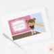 Ce sticker rectangle de fête d'anniversaire pour filles a un thème de ballerine mignon. Une ballerine afro-américaine s'exerce devant un miroir dans son studio de danse de ballet. Sur la gauche, il y a un cadre où vous pouvez personnaliser le nom de la fille d'anniversaire ainsi que son âge. Quelques graphismes de Zenware Designs sur MyGrafico.com