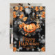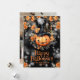 Photo Carte Halloween avec un jack-o'-lanterne portant un casquette sorcier noir et des fleurs orange sur le devant et une photo à l'arrière. Personnalisez facilement cette jolie carte d'Halloween avec votre photo et le nom de famille.