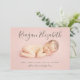 Cartes photos bébé imprimés sur mesure et abordables. Ce design minimaliste élégant est orné d'une typographie élégante superposée sur votre photo de nouveau-né à fond de sang. Personnalisez-le avec le nom du bébé et les statistiques de naissance ou tout autre texte personnalisé. Reverse side dispose d'un motif de diamant géométrique chic. Utilisez les outils de conception pour choisir n'importe quelle couleur arrière - plan, modifier les polices de texte et les couleurs, ajouter plus de photos et créer un unique d'un faire-part de naissance bébé gentil pour votre nouvelle petite fille.