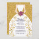 Invitation de mariée moderne avec une mariée dans une robe blanche avec un faux accent floral floral et un bouquet de fleurs violet et or nuptiale sur un classique arrière - plan de la fausse parties scintillant d'or. Retournez notre invitation de wedding shower marié chic et élégant pour voir une parties scintillant correspondante pour une touche spéciale supplémentaire. Invitation de douche nuptiale contemporain pour une douche nuptiale printanière, douche nuptiale estivale, douche nuptiale d'automne ou douche nuptiale d'hiver. Visitez notre boutique pour voir ce design de mariée populaire dans une variété de couleurs.