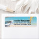 Étiquettes de adresse avec une scène de plage tropicale idyllique. Eau cristalline bleu turquoise et plage de sable brun doux. Des feuilles de palmiers accrochés au-dessus. Un vieux bateau à rames en bois est installé sur la plage. Un paysage serein et paisible.
