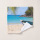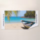 Serviette aménagée avec une scène de plage tropicale idyllique. Eau cristalline bleu turquoise et plage de sable brun doux. Des feuilles de palmiers accrochés au-dessus. Un vieux bateau à rames en bois est installé sur la plage. Un paysage serein et paisible.