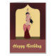 A cute birthday card illustration of a belly dancer in maroon and yellow colours. This lovely girl wears a traditional Arabian belly dancing style costume. Cute Arabian Nights theme. The birthday greeting can be customised to any type of greeting.