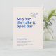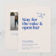 The Belmont design card showcases large typography that says "Come for the wedding. Stay for the cake and open bar." As you glance below, the essential details of the celebration are gracefully presented in a small, classic serif font. The back side is a canvas for another beautiful photo of the couple, allowing a glimpse into their shared journey. A personalized message, thoughtfully crafted by the couple, adds a warm and intimate touch, inviting loved ones to join in the celebration of their union.