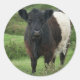 A Belted Galloway Cow, also known as the Oreo cow belties or Panda Cow, looks straight into the camera. Grazing here at Dartmoor National Park.