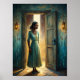 In the image, a dark-skinned woman stands beside an open door, her expression filled with sorrow. Tears stream down her cheeks, glistening in the soft light that spills through the doorway. Her hair frames her face, accentuating the depth of her emotions. She wears a simple, flowing dress that adds to the sense of vulnerability. The background is softly blurred, drawing focus to her poignant expression and the quiet, sombre atmosphere. The scene evokes a powerful sense of longing and heartache, as if she is caught between two worlds.