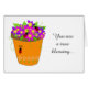 Un pot de fleurs fleuri qui déborde de plantes, des coccinelles qui rampent dessus. Ajoutez votre propre message pour customiser.