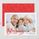Carte photo de vacances élégant avec le mot "Bénédictions" dans une police de script tendance, des espaces réservés photo et texte, et un design moderne rouge et blanc à l'arrière de l'invitation.