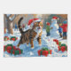 A heartwarming holiday illustration featuring a cheerful cat playing in the snow, wearing a Santa hat and surrounded by colourful gift boxes. In the background, children build a snowman beside a snow-covered Christmas tree, creating a joyful winter wonderland. Perfect for spreading holiday cheer and capturing the magic of Christmas.