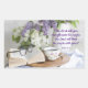 Un vase de lilas, des lunettes, un livre et une tasse de thé, une image apaisante avec des paroles de la Bible "Le Seigneur donnera de la force à son peuple; le Seigneur bénira son peuple avec paix"